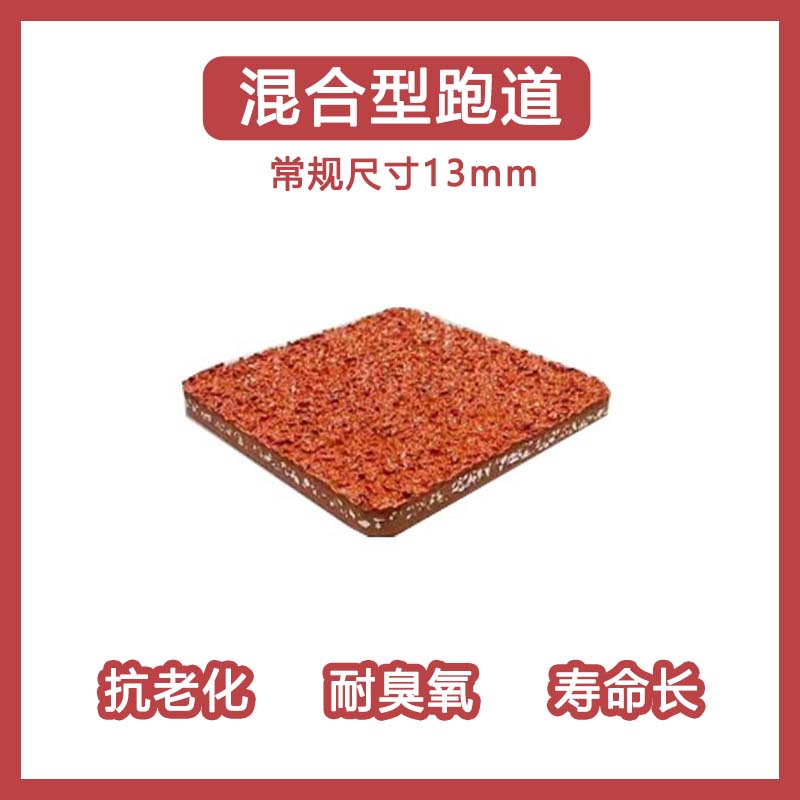 混合型塑胶跑道材料可施工于水泥基础进行防水处理或沥青基础层的塑胶面层材料,材料分为,封底底漆,纯PU(聚氨酯)混合颗粒。面层分为两种,第一种是由专用跑道喷涂面漆与EPDM颗粒搅拌后喷涂而成,超强抗钉性,可吸收强劲冲击,耐老化,色彩鲜艳。第二种是为自结纹防滑面层,不需要掺半任何颗粒,具有良好的物理弹性及高度的抗耐磨性,更好的保护运动减少二次伤害。